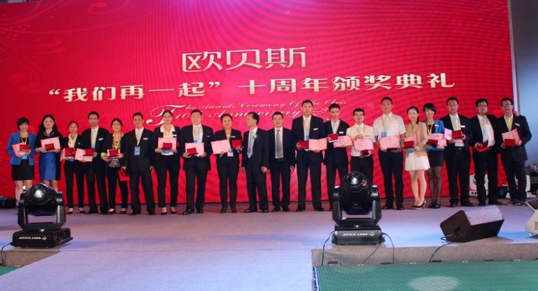 兩個小時的課程過后,本次慶典的重頭戲——歐貝斯“我們再一起”十周年慶典頒獎典禮正式開始。共約30家代理商、50家供應商、20名優秀員工獲得獎項,獎品總價值超過300萬元。