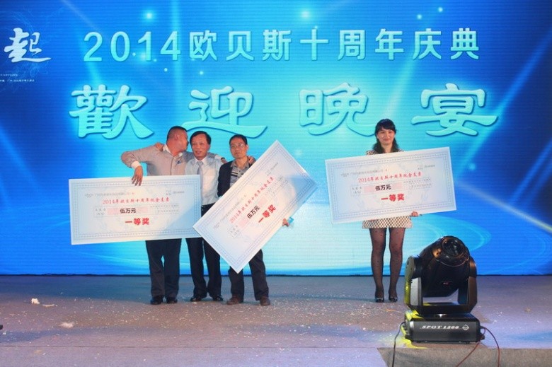 歡迎晚宴的抽獎環節共準備了歐貝斯產品20箱、Iphone5S(土豪金)10部、現金支票一萬元5名、現金支票五萬元3名等豐厚獎項。現場氣氛熱烈,獲獎嘉賓情緒高昂。晚宴賓主盡歡,為本次慶典畫上一個圓滿的句號。